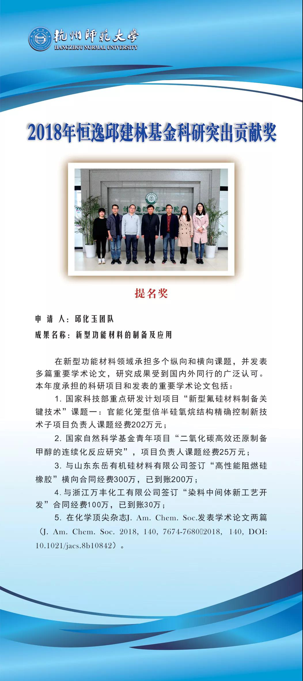 0571-28865505/78974月20日,我校举行首届恒逸邱建林基金表彰会。浙江省恒逸集团有限公司董事长邱建林,我校党委书记陈春雷出席会议并讲话。颁奖仪式对过去一年在科学研究、人才引进、创新创业等方面取得优异成绩的师生及部门进行了表彰。校党委副书记王利琳宣读表彰决定及获奖者名单,其中邱化玉团队被授予“团队提名奖”。